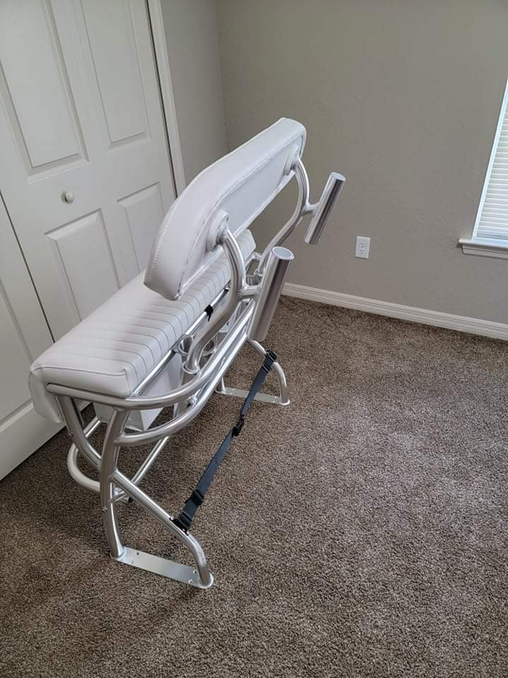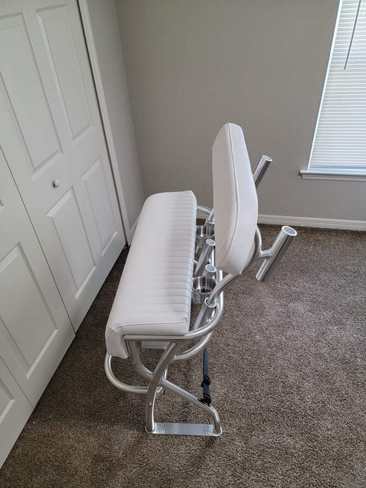Leaning post for center console fishing boat! *Custom sizes available* Upgrade your boat with a brand new leaning post! Sure to be a head turner with this stylish unit. Built out of anodized aluminum, with a pivoting footrest, 4 rod holders, *PLUS AN ADDITIONAL 2 ROCKET LAUNCHERS on the backrest arms so dont miss out on 2 while using your removable backrest! With an under seat storage box, and an adjustable cooler strap to keep your goodies from sliding around and 2 stainless steel cupholders¹ Shipping included. Local pickup also available throughout central Florida.